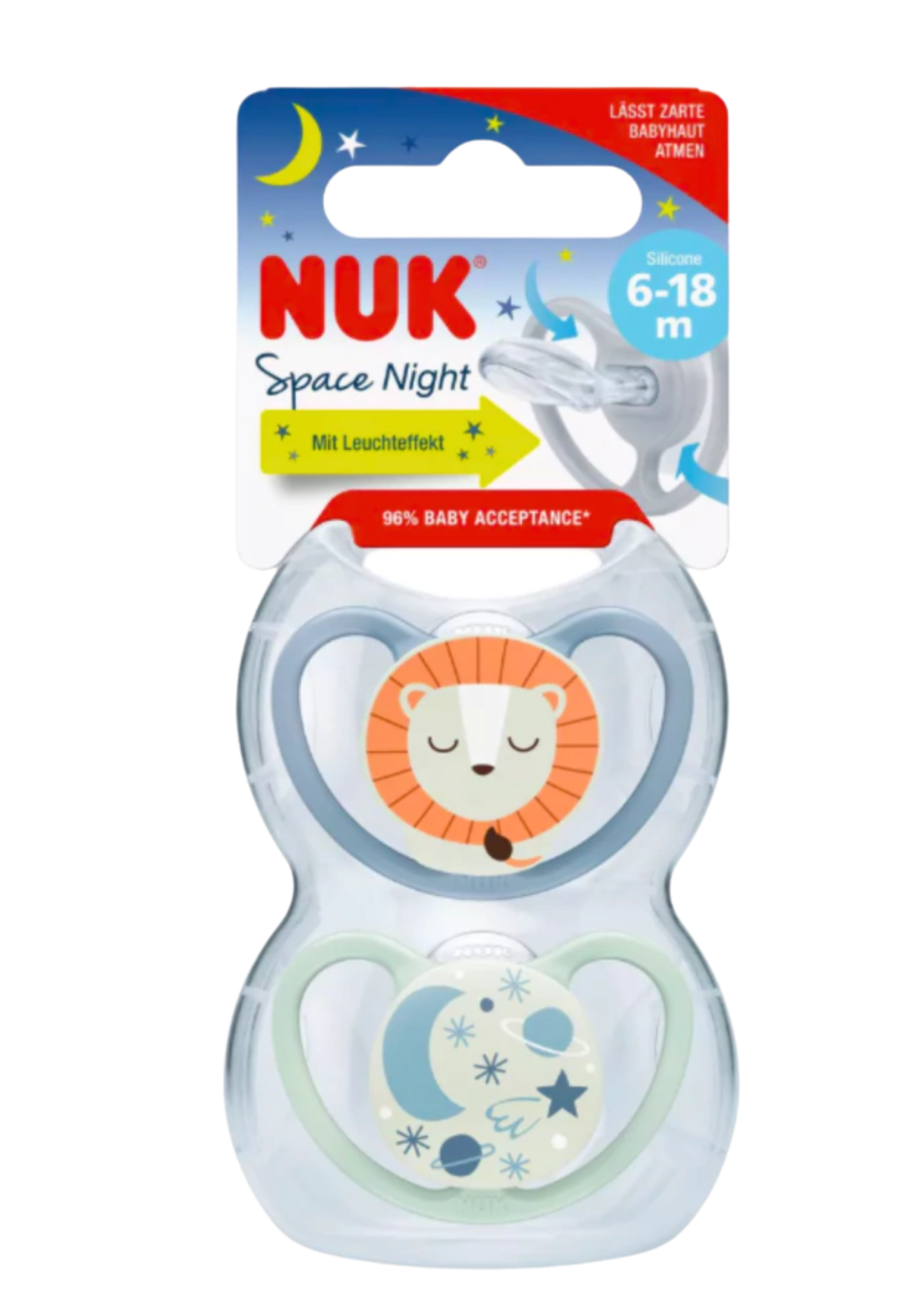 El botón con efecto de brillo en la oscuridad asegura que siempre puedas encontrarlo en medio de la noche, sin importar la iluminación. Con un cuello de tetina más delgado y estrecho, reduce la presión sobre las mandíbulas y los dientes, mientras que su tetina más plana y parte inferior más suave proporciona espacio para movimientos de succión naturales.